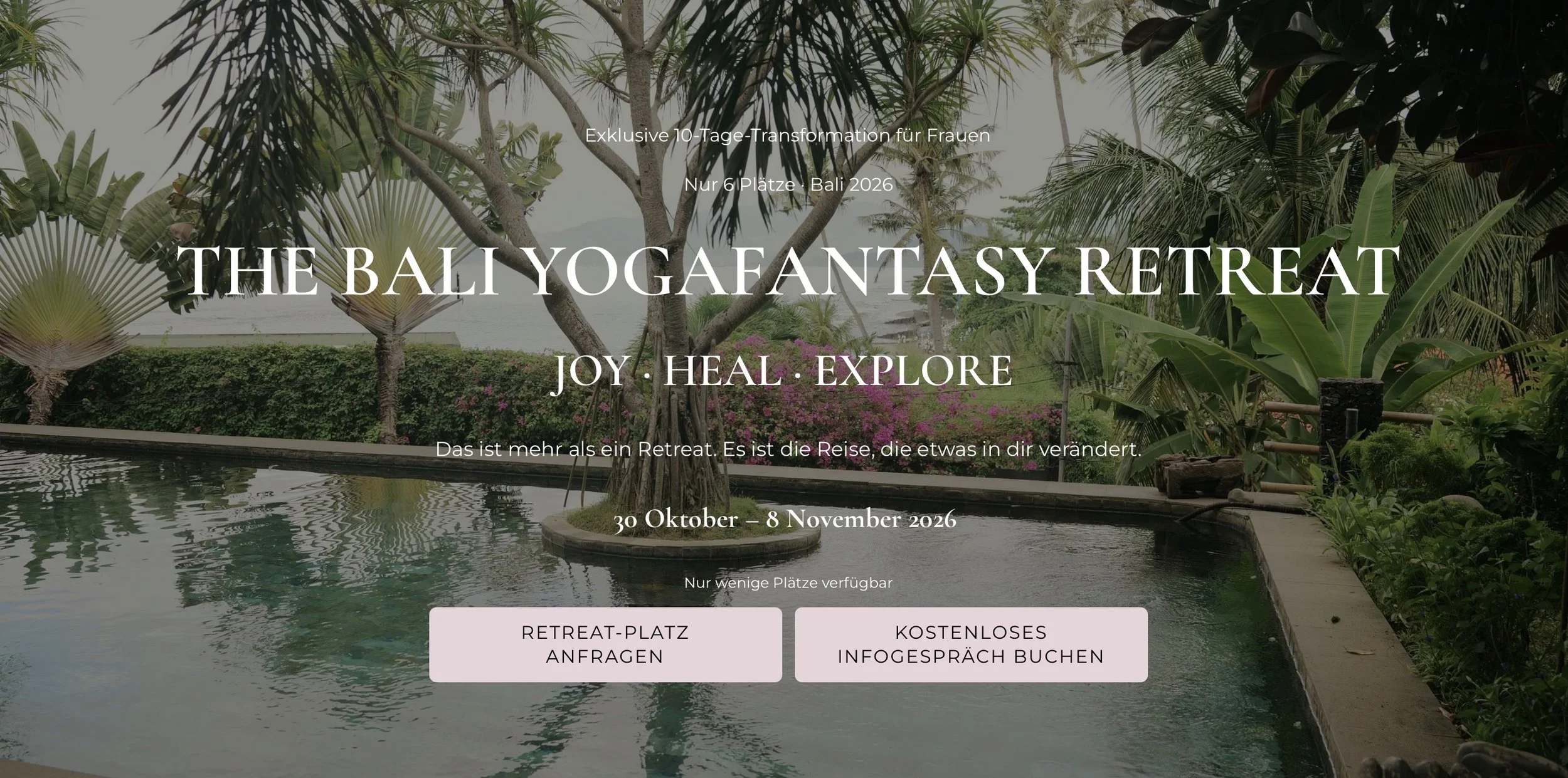 THE BALI YOGAFANTASY RETREAT JOY · HEAL · EXPLORE Freitag, 30. Oktober 2026 19:00 Sonntag, 8. November 2026 11:00 THE BALI YOGAFANTASY RETREAT (Karte) Google Kalender ICS Alle Details ansehen
